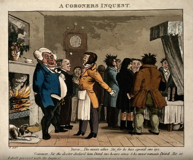 Since coroners could seize the property of criminals, it was in their best interest to investigate suspicious and unusual deaths for signs of wrongdoing. Their job was to determine what caused the death and who was responsible, despite having zero knowledge of medicine or criminal law. Instead of performing an autopsy, they’d hold an inquest.