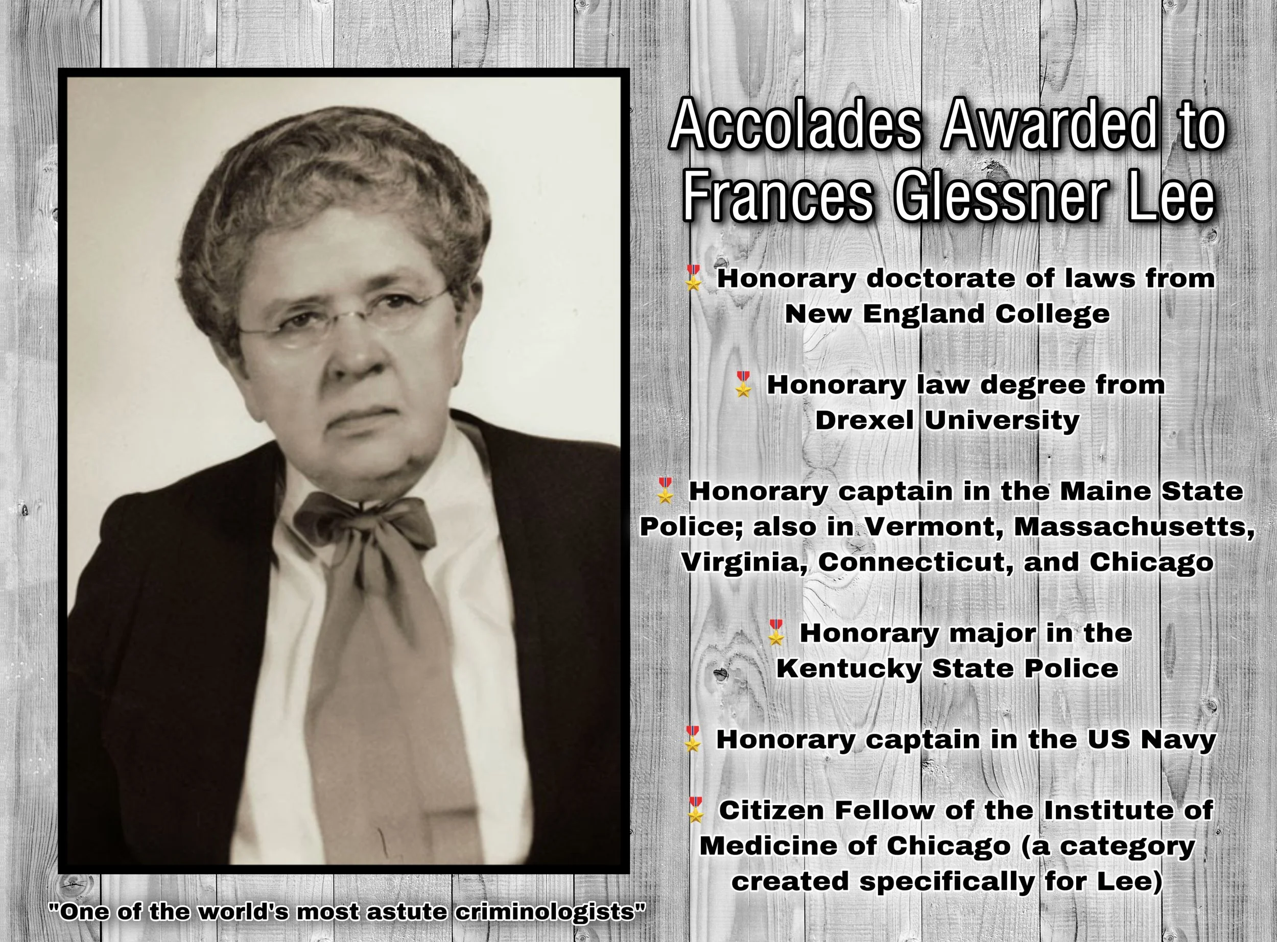 Captain Lee had the last laugh. When she finally died in 1962 (age 83), she left an estate worth about $9.2 million (today’s currency). Most was divided between her children, but she set aside a portion for the Frances Glessner Lee Fund for the Study of Legal Medicine.